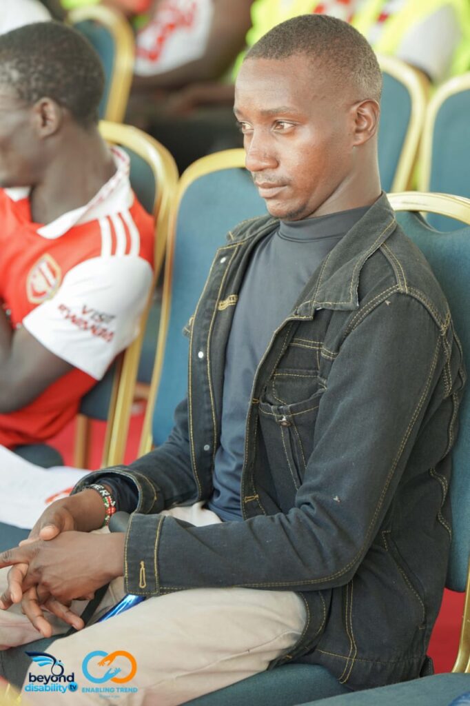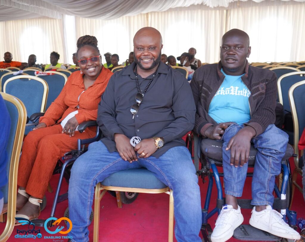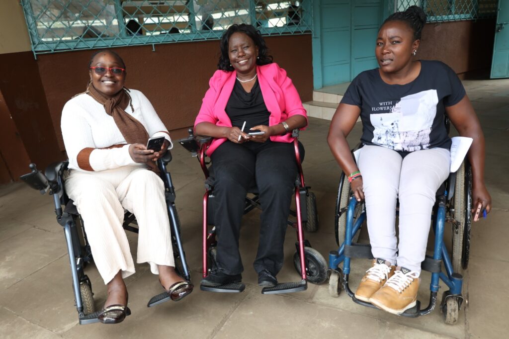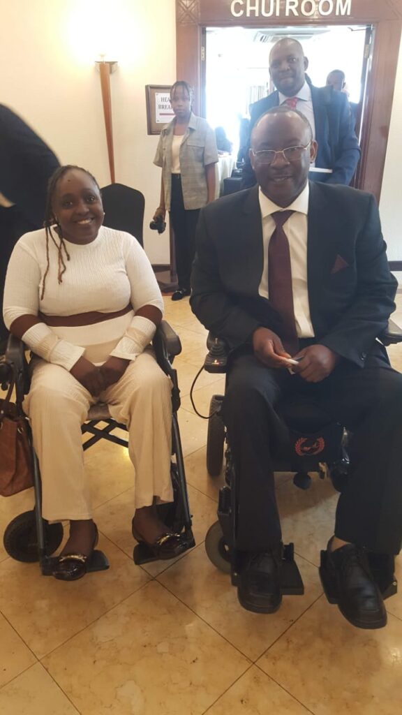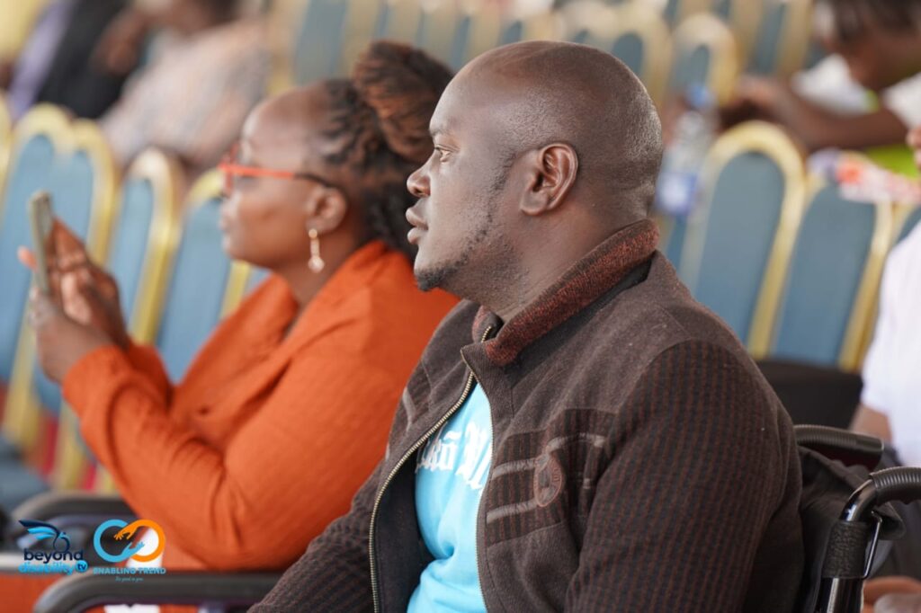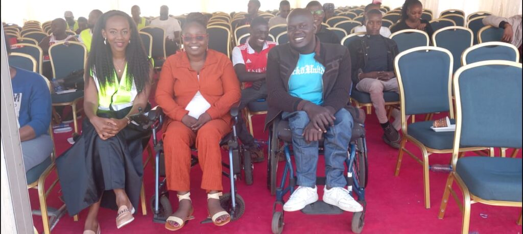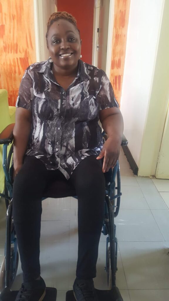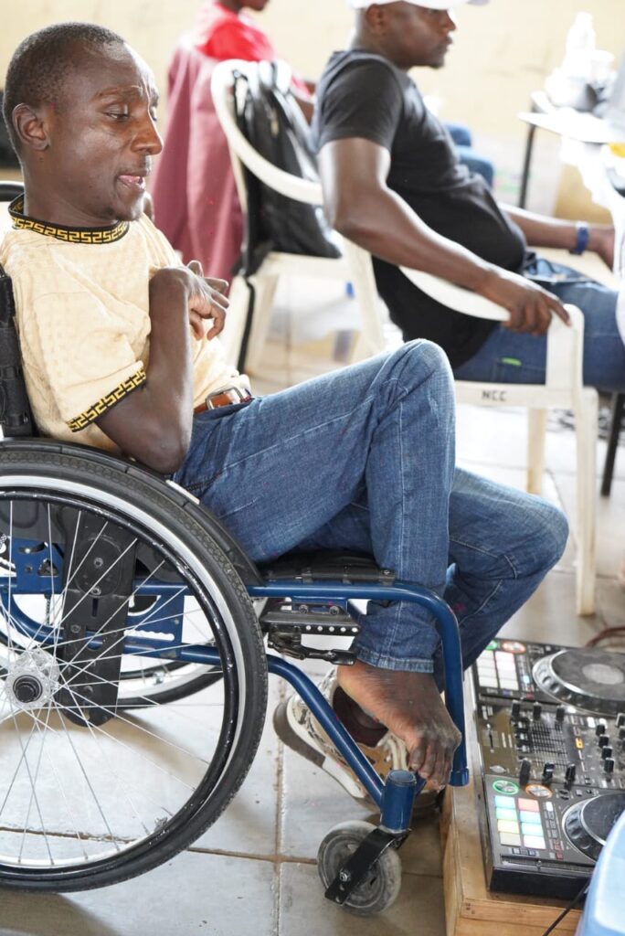 Closeup of startup employee hand holding rim of wheelchair wheel to move in front of desk with laptop with sales charts. Focus on african american man living with disability moving around office.